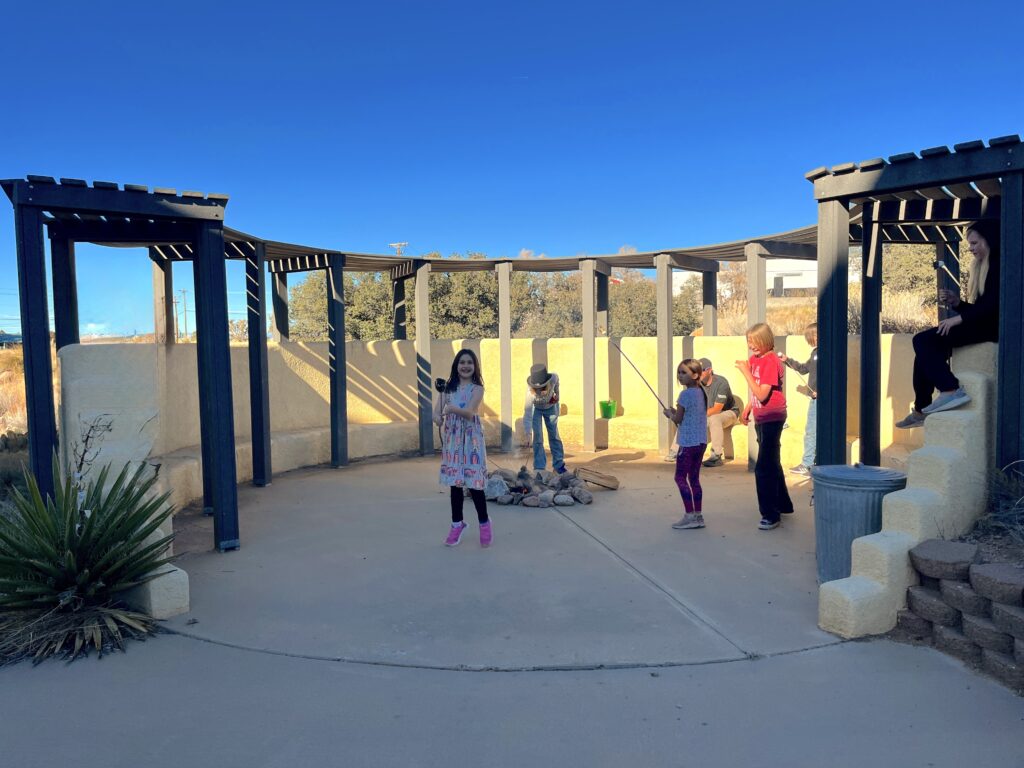 A lovely wooded spot with trails, tables, benches, shade structures, a fireplace/hearth, bathrooms, sand volleyball, tetherball, electricity, and more. It’s an easy 30-minute drive from downtown Albuquerque.